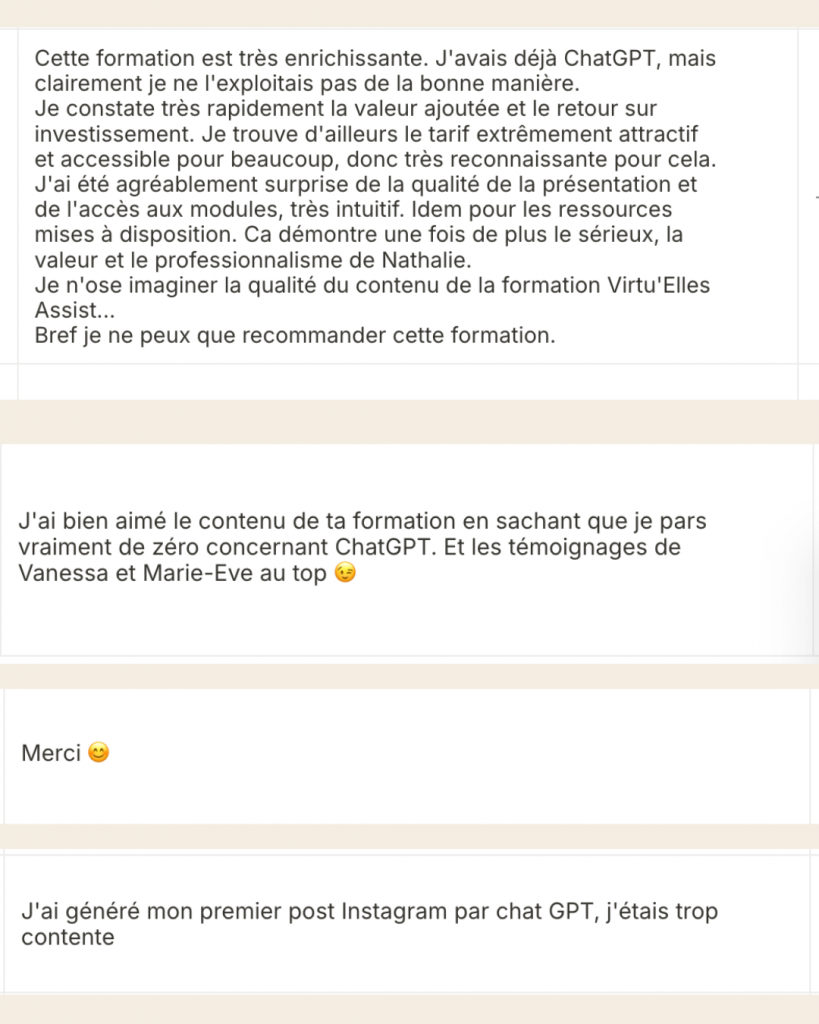 - Support post-formation : Accédez à une communauté d’assistantes virtuelles utilisant ChatGPT et échangez sur les meilleures pratiques.